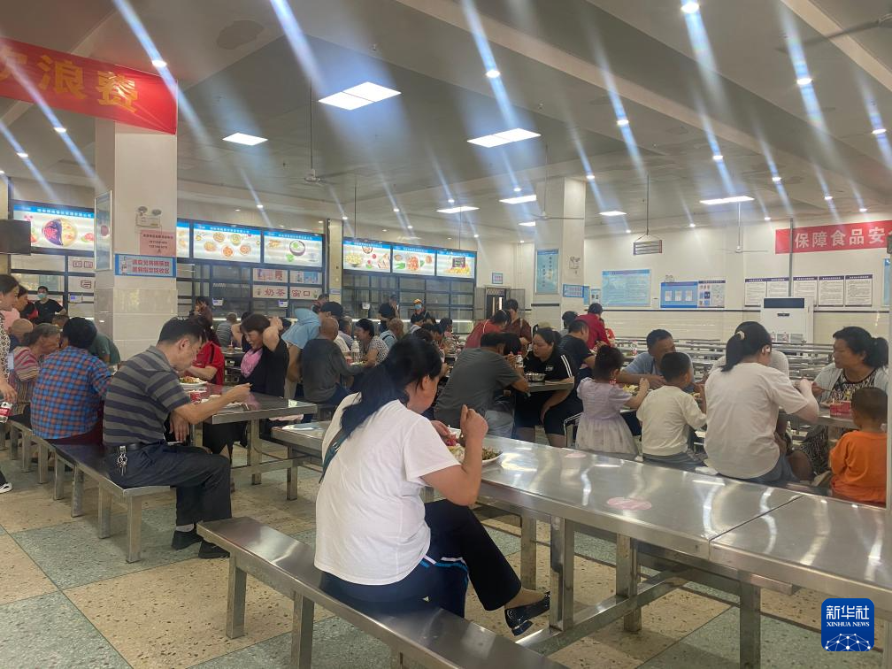 午餐时分,学校食堂飘出青椒炒肉和鸭腿的香气。团洲社区居民车女士在食堂吃饭时,不忘拍摄饭菜和酸奶的照片发给亲戚,她说:“我要拍给亲戚看,不然他们不放心。”