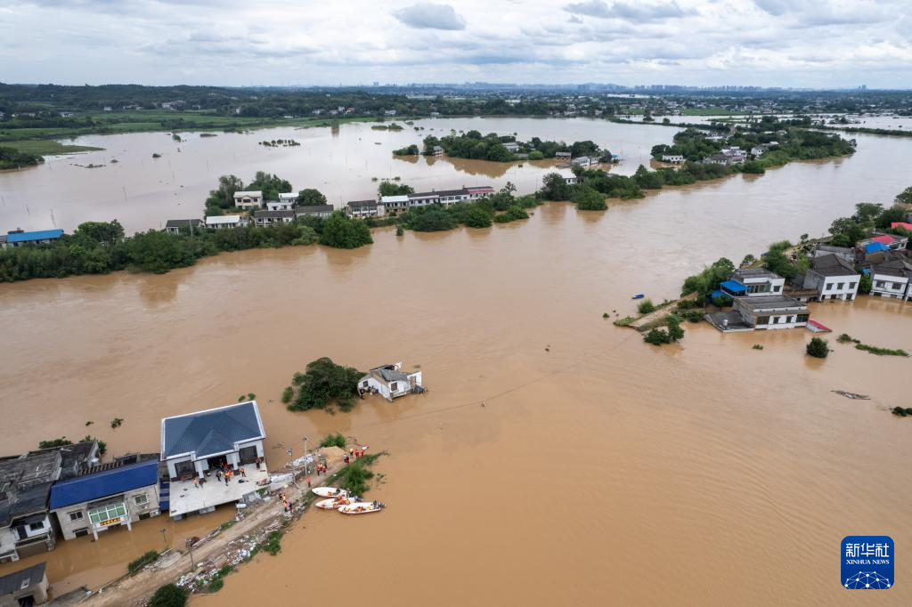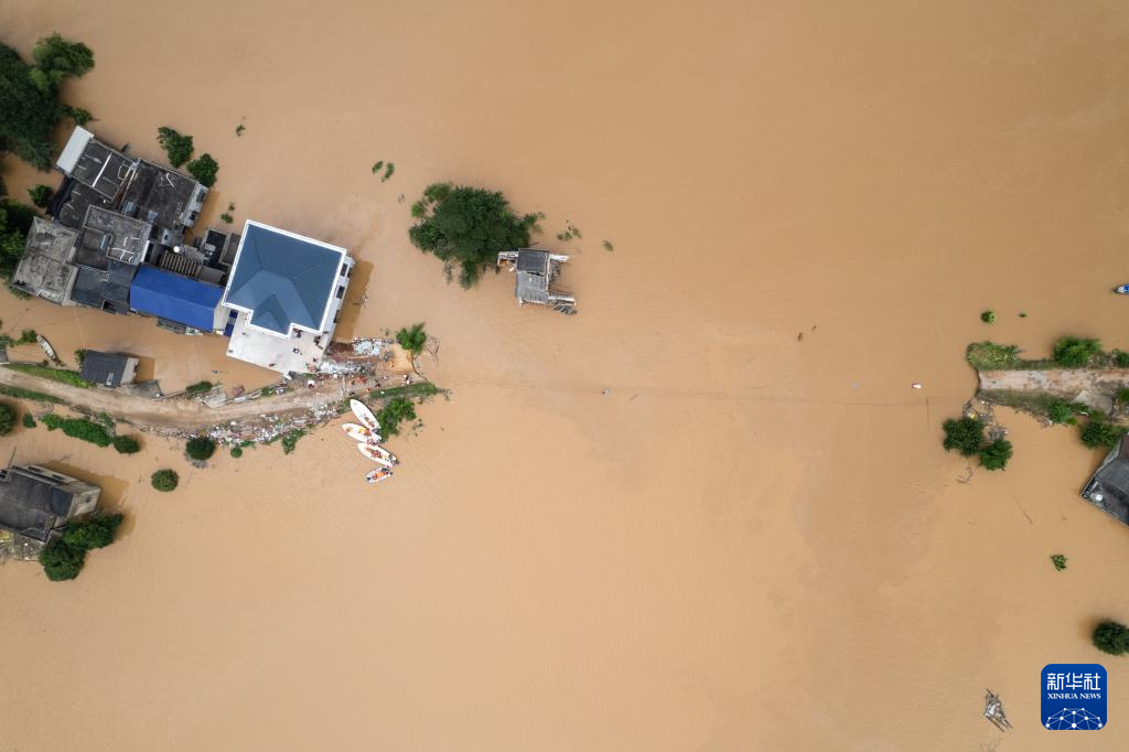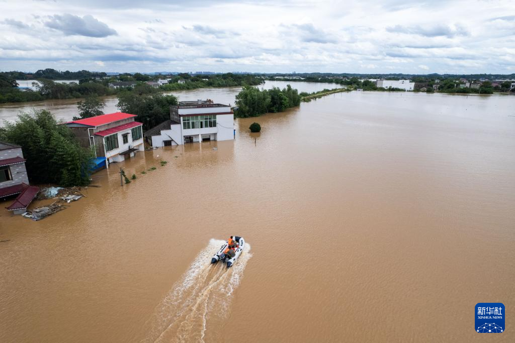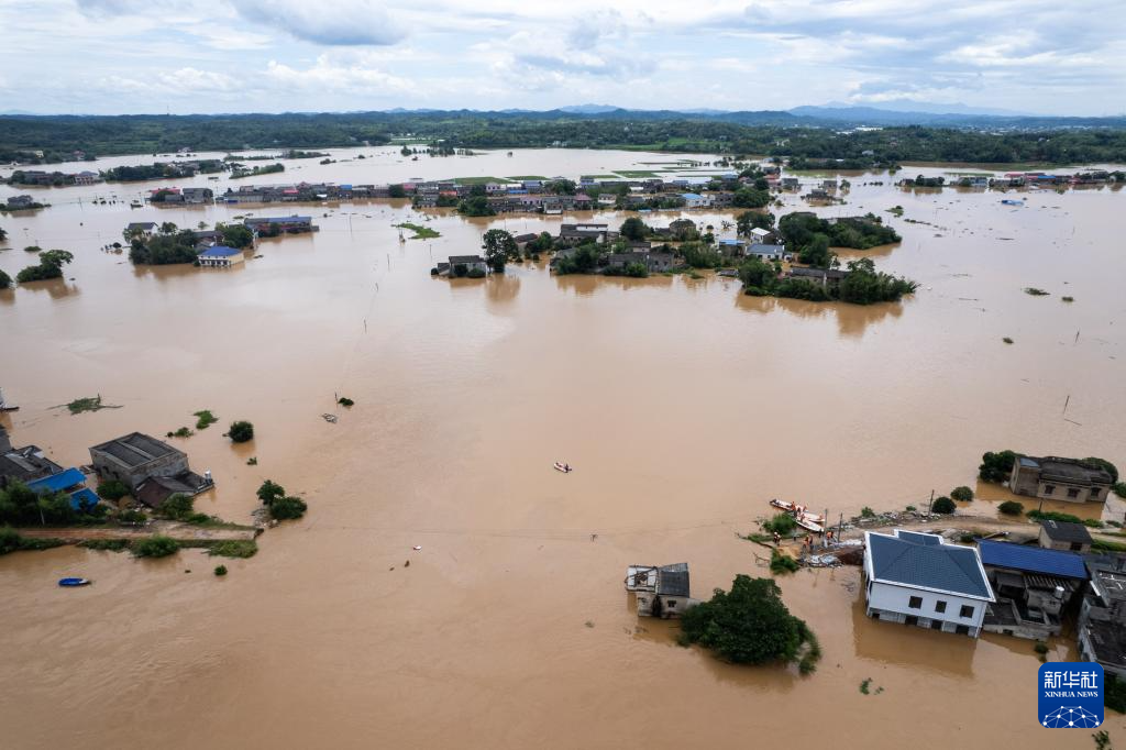 7月29日,在湖南省湘潭县易俗河镇四新堤附近,抢险人员搜寻被困群众(无人机照片)。