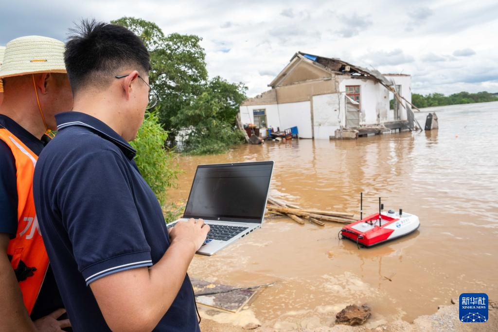 7月29日,在湖南省湘潭县易俗河镇四新堤决口现场,水利部门工作人员测量决口附近的水深、流速等信息。新华社记者 陈思汗 摄pagebreak