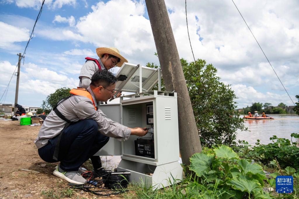 7月29日,在湖南省湘潭县易俗河镇四新堤决口现场,抢险人员安装水文遥测仪。新华社记者 陈思汗 摄pagebreak
