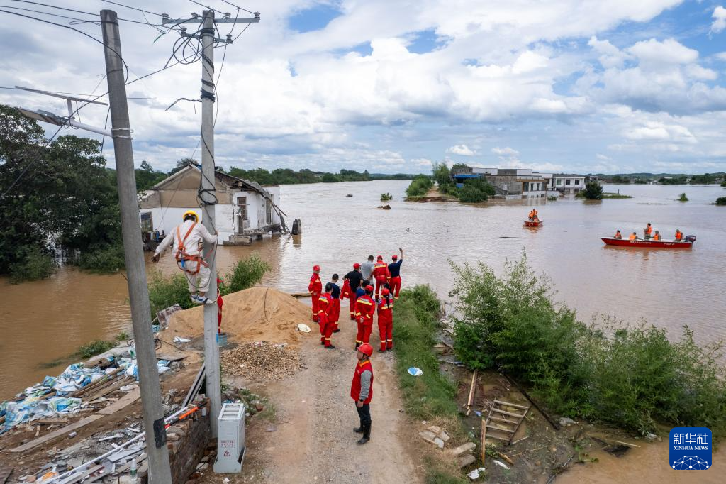 7月29日,在湖南省湘潭县易俗河镇四新堤决口现场,抢险人员处理决口附近的电线(无人机照片)。新华社记者 陈思汗 摄