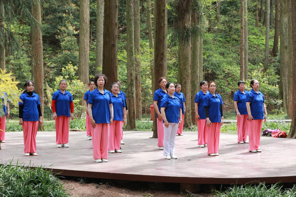 健身队伍在水杉林里进行八段锦、太极拳展演(许梦娟摄)