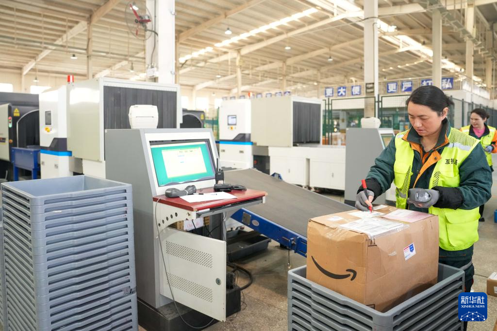 12月10日,工作人员在长沙国际邮件互换局为进口包裹贴上清关完成的标签。新华社记者 薛宇舸 摄pagebreak