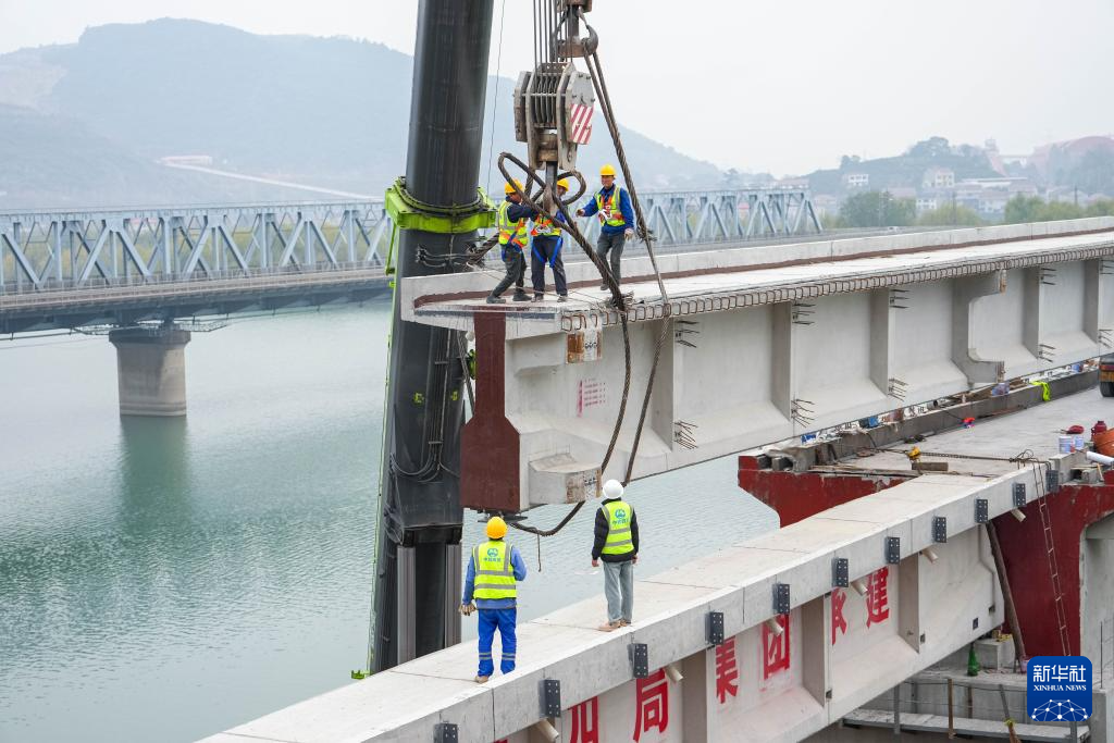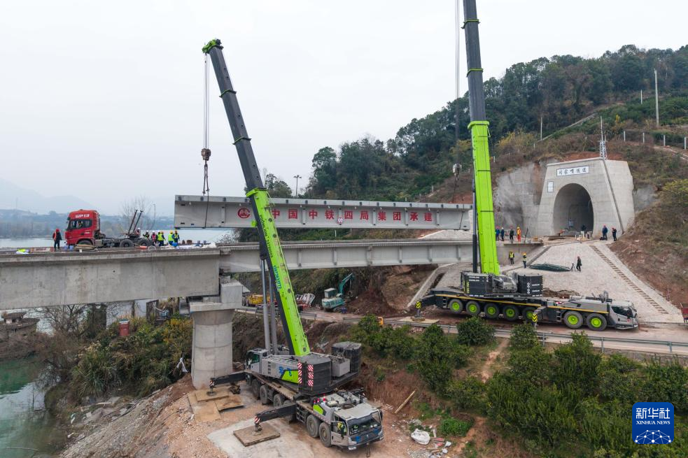 12月29日,在位于常德市石门县的陕煤铁路专用线澧水特大桥施工现场,中铁四局工人在进行架梁作业。新华社记者 陈思汗 摄pagebreak