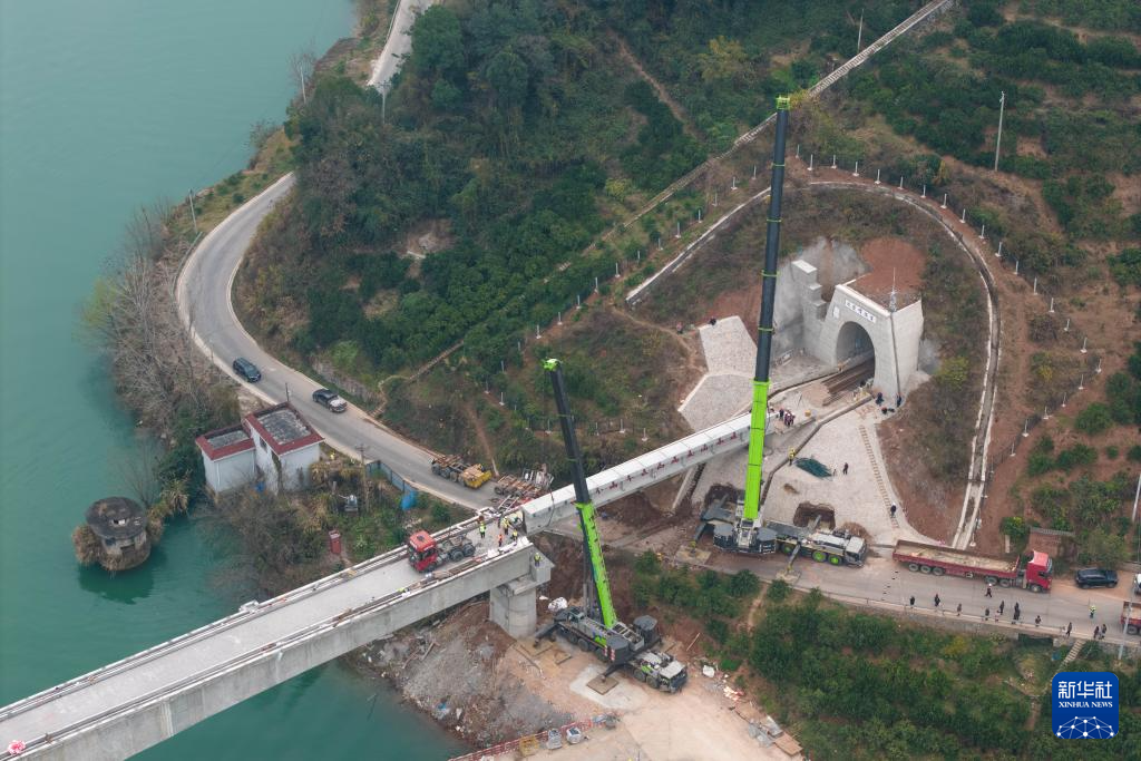 这是12月29日在常德市石门县陕煤铁路专用线澧水特大桥拍摄的架梁作业现场(无人机照片)。新华社记者 陈思汗 摄