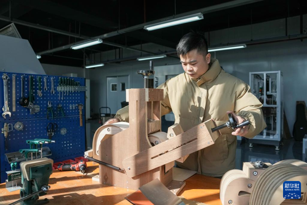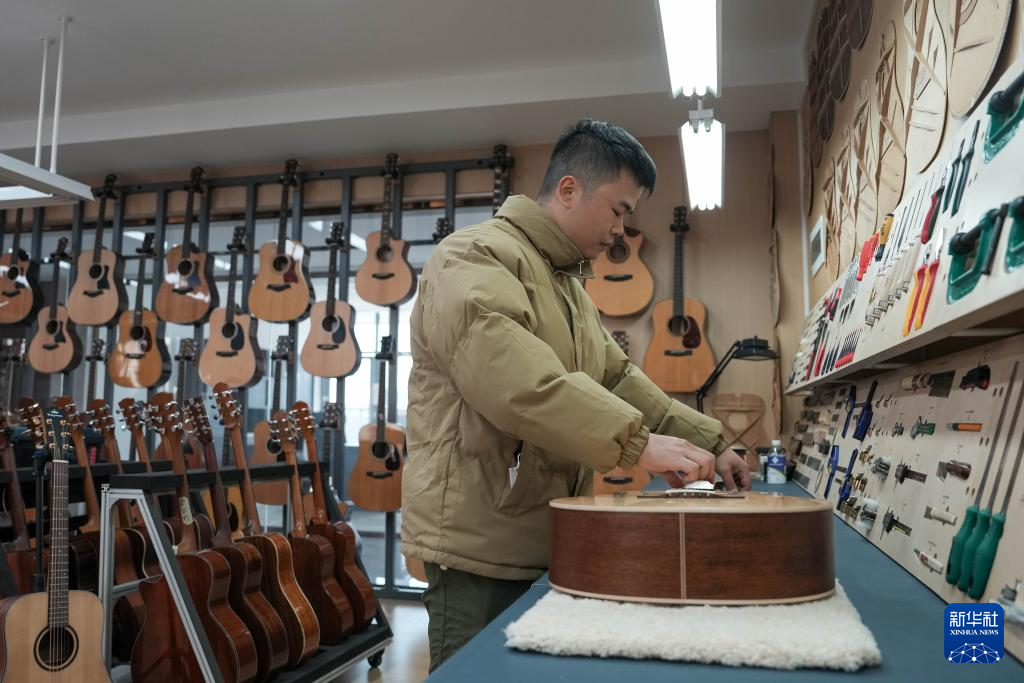 1月7日,研发人员在湖南宁乡的湖南省卡玛乐器制造有限公司研发试验室手工制作一把定制吉他。新华社记者 薛宇舸 摄