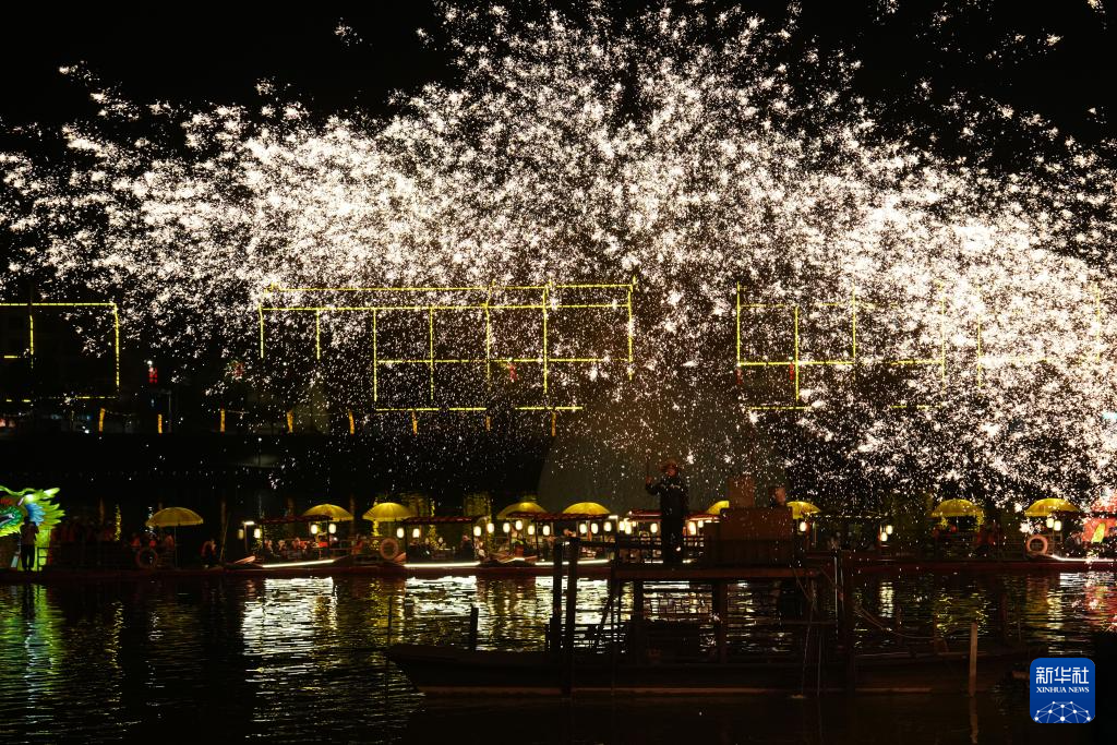 1月9日,游客在南岳里观看水上舞蹈演出。