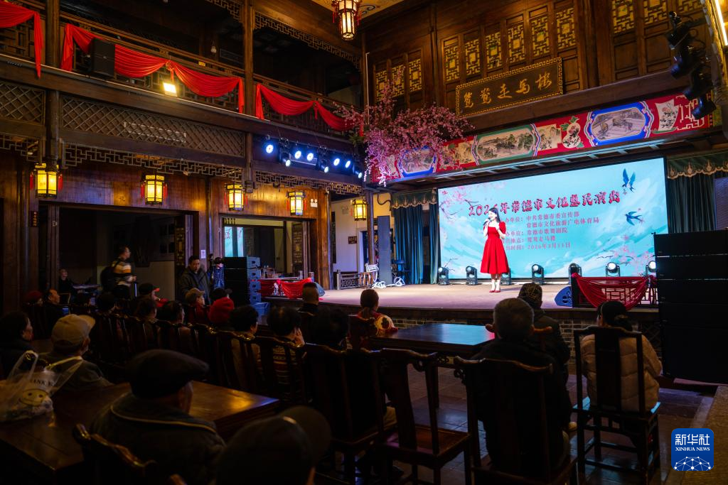 3月11日,在常德穿紫河畔的鸳鸯走马楼,文艺工作者为游客带来惠民演出。新华社记者 陈思汗 摄pagebreak