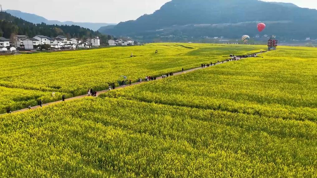 广元市朝天区羊木镇东山村千亩油菜花进入盛花期,当地推出花田火锅、烤肉,举办乡村音乐会、特色集市,打造“赏花+美食+文旅+消费”新业态。